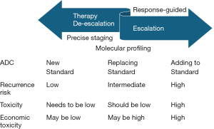 As a trend, neoadjuvant and adjuvant therapy using ADC is being developed in de-escalation and escalation directions (Figure 1). For breast cancer with a low risk of recurrence, new standard treatments engaged with ADCs are being explored after careful staging and molecular profiling (93-95). On the other hand, for patients with a high risk of recurrence and poor prognosis, such as residual invasive diseases remaining after preoperative systemic therapy (90-92), the development of standard treatment + ADC therapy is progressing. In the intermediate-risk group, the replacement of standard treatment with ADCs is being investigated. A response-guided approach is used in the treatment escalation and replacement process. Treatment-induced toxicity must be minimised in the treatment of low-risk patients. Regarding economic toxicity, replacing existing treatments with less toxic and less expensive therapies is desirable, especially in low-risk cases, but this might not be easy to realise, considering the current cost of ADCs (96-98).
