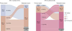 Between June 2022 and December 2023, 283 patients were diagnosed with HER2-low MBC, and 70 patients met the eligibility criteria. Among them, 37 were in the IHC 1+ group and 33 were in the IHC 2+ group. The flow chart of patient selection is shown in Figure S2. The median follow-up time was 7.5 months. Figure 1 shows the IHC scores of primary and metastatic lesions and the IHC conversion between paired lesions. In the IHC 1+ group, 16 patients had IHC 0 in the primary lesion, which all converted to IHC 1+ in the metastatic lesion. In the IHC 2+ group, 10 patients had IHC 0 or 1+ in the primary lesion, which all converted to IHC 2+ in the metastatic lesion.