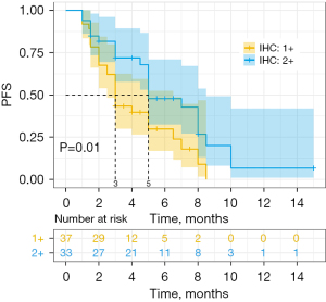 At the time of the last follow-up, 50 (71.4%) patients reached the primary endpoint. In all patients, the median PFS was 5 months, with a 95% confidence interval (CI) of 3 to 7 months (Figure S3). Figure 2 shows the PFS curves of the IHC 1+ and IHC 2+ groups, with a median PFS of 3 and 5 months, respectively (P=0.01). The clinical efficacy outcomes are detailed in Table S1. In all patients, no cases of CR were observed, PR was achieved in 15 patients (21.4%), SD was seen in 38 patients (54.3%), and PD occurred in 17 patients (24.3%). The ORR was 21.4% (15 out of 70 patients), and the CBR was 30% (21 out of 70 patients). The IHC 2+ group showed numerically higher ORR (27.3% vs. 16.2%) and CBR (36.4% vs. 24.3%) compared to the IHC 1+ group, but no statistical difference was observed (both P values were 0.40).