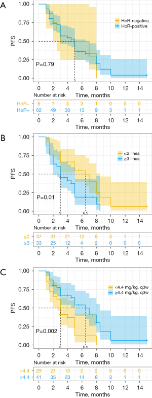 Figure 3 displays the PFS curves categorized by HoR status, prior lines of chemotherapy, and initial doses of T-DXd. It is worth mentioning that the median PFS of T-DXd in both HoR-positive and HoR-negative patients was similar to that of the whole population (both had a median PFS of 5 months, with a P value of 0.79, Figure 3A). Patients who had received 3 or more lines of prior chemotherapy had a lower PFS compared to those who had received 2 or fewer lines (median PFS: 3 vs. 6.5 months, P=0.01, Figure 3B). Patients were divided into two groups based on their initial T-DXd doses, using a cutoff value of 4.4 mg/kg. The patients in the high-dose group had a longer PFS compared to those in the low-dose group (median PFS: 6.5 vs. 3 months, P=0.002, Figure 3C).