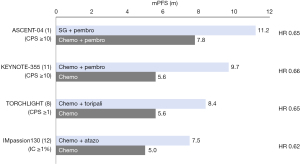 Compared with chemotherapy plus immunotherapy, SG plus immunotherapy significantly improved the median PFS in PD-L1 positive (CPS ≥10) mTNBC {11.2 months [95% confidence interval (CI): 9.3–16.7 months] vs. 7.8 months (95% CI: 7.3–9.3 months), HR =0.65 (95% CI: 0.51–0.84), P<0.001}. This met the primary endpoint, demonstrating a statistically and clinically meaningful improvement in PFS, and is longer than the PFS of other first-line immunotherapy-containing phase 3 trials for mTNBC (Figure 2). Moreover, the PFS curves of the two groups showed early separation, with the benefit increasing over time. Looking back at the enrolled population, nearly 20% experienced rapid progression, and nearly 50% showed failure to prior taxane. Achieving a PFS of 11.2 months with SG plus immunotherapy indicates significant efficacy. The key secondary endpoint OS data is not yet mature and has an early trend of improvement. The ORR of the SG plus immunotherapy group was higher (60% vs. 53%), especially the complete response (CR) rate was higher (13% vs. 8%), and the DoR was significantly prolonged (16.5 vs. 9.2 months), indicating faster and more sustained anti-tumor activity of SG plus immunotherapy.