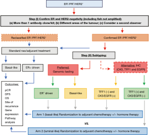 Therefore, we propose a prospective study of adjuvant hormone therapy involving a two-step assessment as shown in Figure 1 could be considered to answer the adjuvant questions. During screening the tumours would be evaluated in two steps evaluation, in (I) the subtype must be confirmed by standard IHC, followed by (II) intrinsic subtyping and by IHC assessment of specific markers; CK5, TFF1 and EGFR, being than assigned to receive chemotherapy +/− hormonal therapy controlled by the phenotype as shown on Figure 1. Although this proposal suggests a potential approach to answer a challenging question, further refinement might be required to this clinical trial design once limitations could be expected, such as potentially slow accrual.